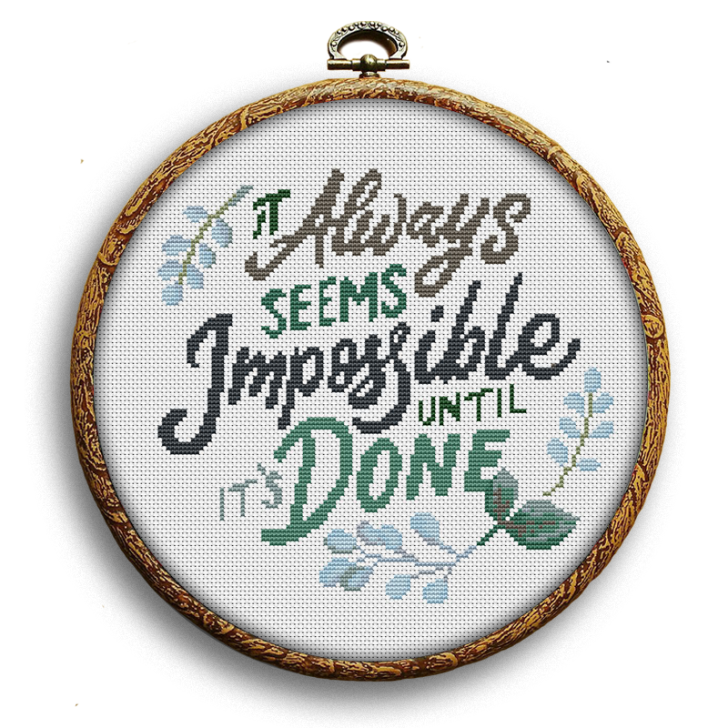 Embark on a journey of motivation and accomplishment with our empowering cross stitch pattern, 'It always seems impossible until it's done.' Stitching these words not only decorates your space but serves as a daily reminder of resilience and triumph. Whether for yourself or a thoughtful gift, this pattern encourages perseverance and celebrates the joy of overcoming challenges. Craft a piece of inspiration and transform your surroundings with this empowering cross stitch quote.
